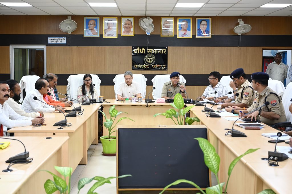 फतेहपुर । आगामी रामनवमी व गणेश उत्सव को सकुशल, शांतिपूर्ण और सौहार्दपूर्ण वातावरण में संपन्न कराने के उद्देश्य से सोमवार को कलेक्ट्रेट परिसर स्थित गांधी सभागार में जिला स्तरीय पीस कमेटी की बैठक आयोजित की गई। बैठक की अध्यक्षता डीएम रविंद्र सिंह और एसपी अभिमन्यु मांगलिक ने संयुक्त रूप से की। इसमें प्रशासनिक व पुलिस अधिकारियों के साथ विभिन्न धर्मों के धर्मगुरु, व्यापारी, समाजसेवी और गणमान्यजन शामिल हुए। बैठक की शुरुआत डीएम और एसपी ने उपस्थित लोगों को आगामी त्योहारों की अग्रिम शुभकामनाएं देते हुए आपसी प्रेम, भाईचारे और गंगा-जमुनी तहजीब के साथ पर्व मनाने की अपील से की। डीएम रविंद्र सिंह ने रामनवमी और गणेश उत्सव की तैयारियों की बिंदुवार समीक्षा करते हुए साफ-सफाई, पार्किंग, बैरिकेडिंग और धार्मिक स्थलों के आसपास व्यवस्थाएं समयबद्ध ढंग से पूरी करने के निर्देश दिए। उन्होंने बिना प्रशासनिक अनुमति के सार्वजनिक स्थलों पर सांस्कृतिक कार्यक्रम या पंडाल न लगाने तथा हाईटेंशन लाइनों से दूर सुरक्षित स्थानों पर पंडाल स्थापित करने को कहा। साथ ही अग्निशमन यंत्र और बालू जैसे सुरक्षा संसाधन उपलब्ध रखने के निर्देश आयोजकों को दिए।