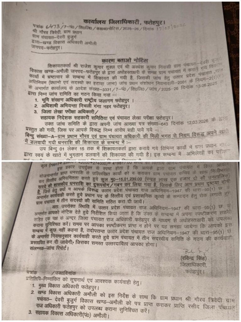 अमौली, फतेहपुर । अमौली विकास खंड की देवरी बुजुर्ग ग्राम पंचायत में विकास कार्यों के नाम पर करीब 15 लाख रुपए की वित्तीय अनियमितता सामने आने के बाद प्रशासन ने ग्राम प्रधान पर शिकंजा कस दिया है। जांच रिपोर्ट में 15 लाख 1 हजार 239 रुपए के गबन की पुष्टि होने पर जिलाधिकारी ने ग्राम प्रधान गौरव त्रिवेदी को नोटिस जारी कर जवाब तलब किया है। शिकायत मिलने पर गठित तीन सदस्यीय जांच समिति ने हैंडपंप री-बोर, इंटरलॉकिंग, नाली निर्माण, स्वच्छता, पंचायत भवन और कायाकल्प कार्यों का स्थलीय सत्यापन किया। जांच में पाया गया कि कई कार्यों में भुगतान तो दर्शाया गया, लेकिन मौके पर कार्य अधूरे या मानक के अनुरूप नहीं मिले। कुछ भुगतान फर्मों और निजी खातों में किए जाने की भी पुष्टि हुई। शिकायतकर्ताओं राजेश कुमार शुक्ला और अवधेश कुमार की शिकायत पर जिलाधिकारी रवीन्द्र सिंह ने भूमि संरक्षण अधिकारी, जिला लेखा परीक्षा अधिकारी तथा निचली गंगा नहर के अधिशासी अभियंता की समिति बनाकर जांच कराई थी। रिपोर्ट के आधार पर प्रधान और सचिव से स्पष्टीकरण मांगा गया है। नोटिस में कहा गया है कि संतोषजनक जवाब न मिलने पर ग्राम प्रधान के वित्तीय व प्रशासनिक अधिकार सीज कर ग्राम पंचायत संचालन के लिए तीन सदस्यीय समिति गठित की जाएगी।