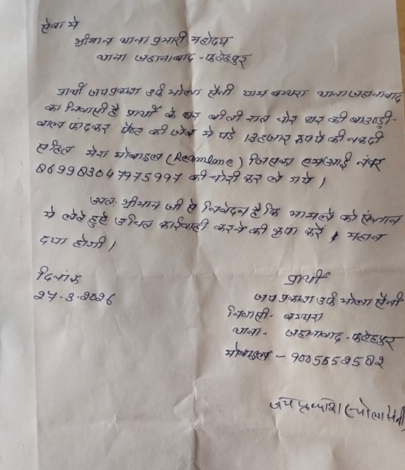 जहानाबाद, फतेहपुर । थाना क्षेत्र में चोरी की घटनाएं थमने का नाम नहीं ले रही हैं। ताजा मामला ग्राम बंथरा का है, जहां अज्ञात चोर घर में घुसकर नकदी और मोबाइल चोरी कर ले गए। चोरी की घटना से ग्रामीणों में दहशत है।