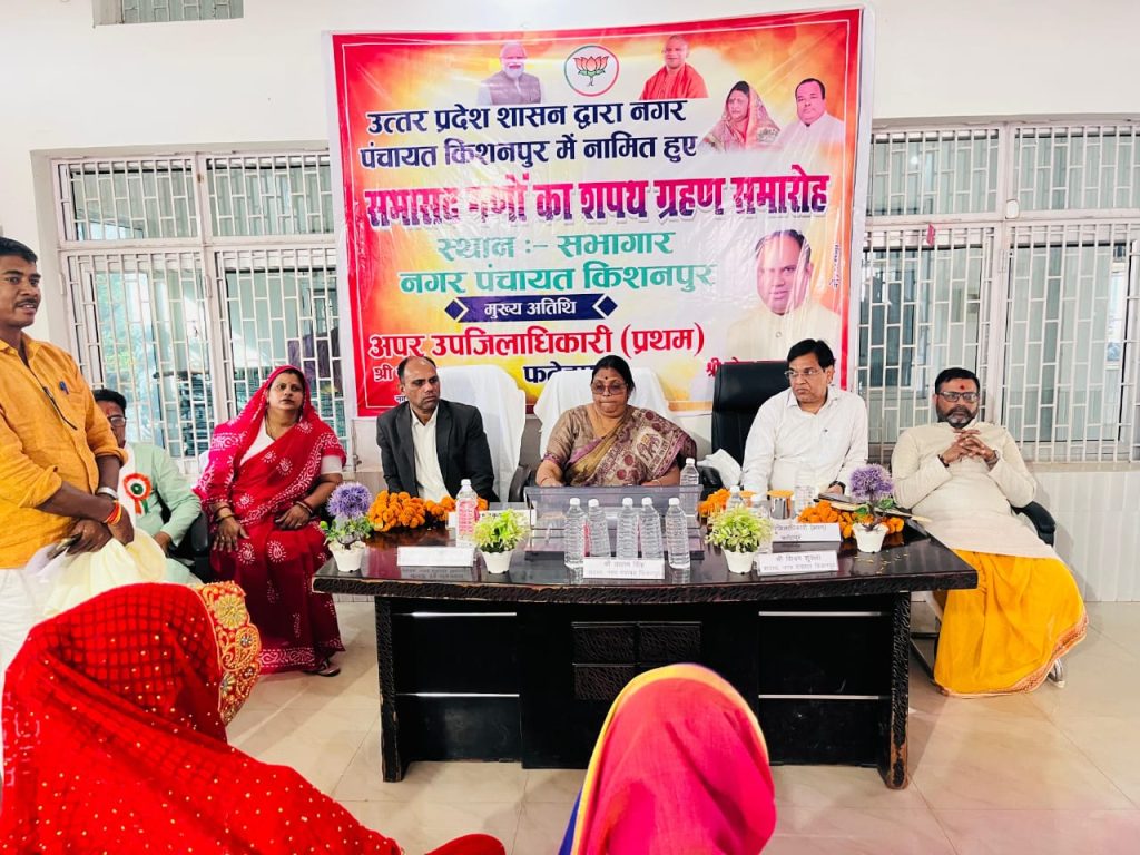 फतेहपुर । किशनपुर नगर पंचायत कार्यालय में सोमवार को मनोनीत सभासदों का शपथ ग्रहण समारोह आयोजित किया गया। समारोह में अपर उपजिलाधिकारी प्रथम दुर्गेश यादव ने क्षेत्रीय विधायक कृष्णा पासवान की उपस्थिति में तीन मनोनीत सभासदो उत्तम सिंह, शिवम शुक्ला और रेनू मोदनवाल को पद एवं गोपनीयता की शपथ दिलाई। शासन द्वारा हाल ही में इन तीनों को नगर पंचायत का मनोनीत सभासद नियुक्त किया गया था।