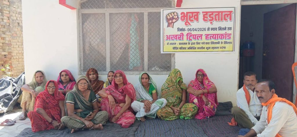 फतेहपुर । खागा क्षेत्र के चर्चित अखरी ट्रिपल हत्याकांड में पीड़ित परिवार ने प्रशासन के खिलाफ मोर्चा खोलते हुए अनिश्चितकालीन धरना और भूख हड़ताल शुरू कर दी है। किसान नेता स्वर्गीय पप्पू सिंह (अखरी), उनके भाई स्वर्गीय अनूप सिंह (पिंकू) तथा बेटे अभय प्रताप सिंह की हत्या के बाद प्रशासन द्वारा परिवार को कई आश्वासन दिए गए थे, लेकिन लंबे समय बाद भी वादे पूरे न होने से परिजनों में नाराजगी है। धरने पर बैठीं ग्राम प्रधान रामदुलारी, स्वर्गीय अनूप सिंह की पत्नी मनीषा सिंह सहित परिवार की अन्य महिलाएं प्रशासन से किए गए सभी वादों को तत्काल लागू करने की मांग कर रही हैं। उनका कहना है कि जब तक प्रशासन लिखित और ठोस कार्रवाई नहीं करेगा, तब तक भूख हड़ताल जारी रहेगी। धरना स्थल पर ग्रामीणों और समर्थकों की भीड़ जुटने लगी है, जिससे क्षेत्र में मामला फिर चर्चा का विषय बन गया है।